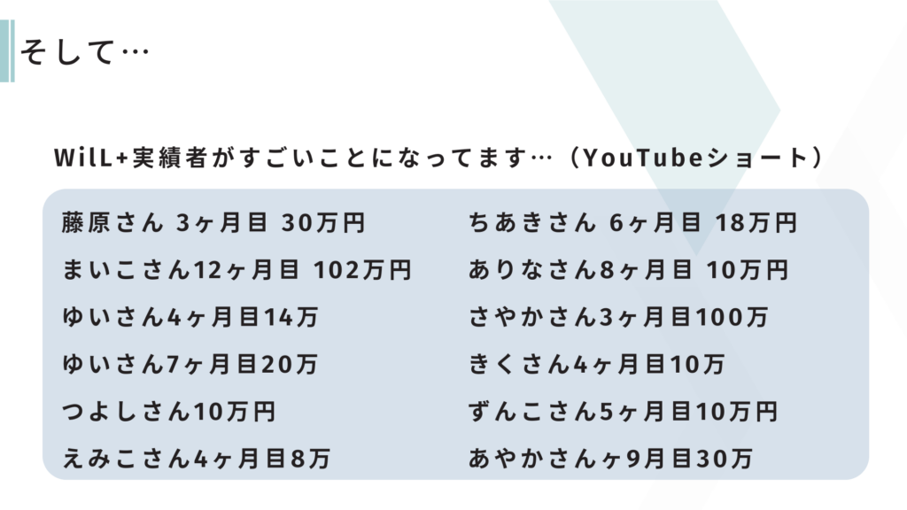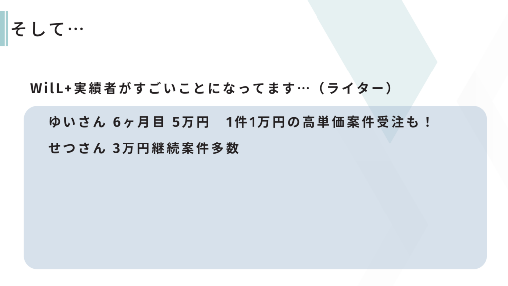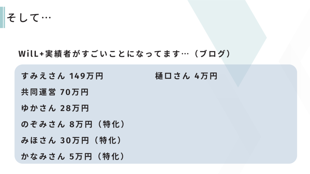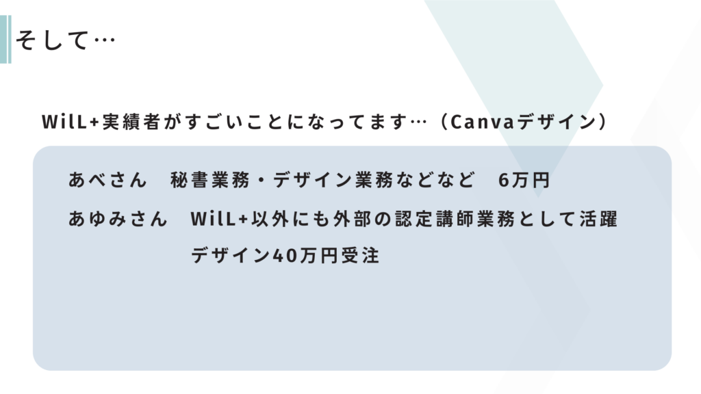 WilL+では、4つのクラス(ブログ・ショート動画・デザイン・ライター)それぞれでしっかりと成果を出されていましたね!